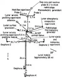 Le boîtier électronique est situé au centre de la photo. Deux câbles le relient à chaque capteur. Stocké dans le deuxième paquet. Les forages effectués pour installer les capteurs rencontrèrent plus de résistance que prévu. Ceux-ci ne purent pas être enfoncés à la profondeur demandée. Les données recueillies ne purent pas être exploitées jusqu'à ce qu'elles puissent être comparées aux données recueillies par l'expérience similaire d'Apollo 17. |