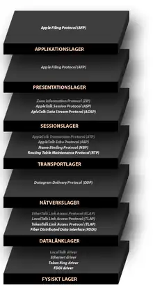 Pile de protocoles d'AppleTalk en relation avec le modèle OSI de communication informatique