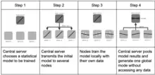 En intelligence artificielle et en apprentissage machine, l'apprentissage fédéré (en anglais : federated learning ou collaborative learning) est un paradigme d'apprentissage dans lequel plusieurs machines entrainent collaborativement un modèle d'intelligence artificielle tout en gardant leurs données localement[1]. Ainsi, les machines impliquées dans l'apprentissage se contentent d'envoyer les modèles appris sur leurs données locales, et non les données elles-mêmes[2]. Ce paradigme s'oppose à l'apprentissage centralisé dans lequel toutes les données sont transmises à un serveur central chargé d'exécuter l'apprentissage du modèle.