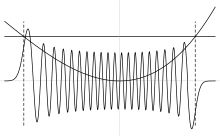 - Dans la région classiquement interdite la probabilité de présence sera exponentiellement décroissante en . En effet, là où , on a alors et le terme exponentiellement croissant sera en général divergent et donc non physique. La normalisation de la fonction d'onde impose alors .