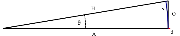La longueur du coté opposé, O, est approximativement égal à la longueur de l'arc bleu, s . D'après la géométrie, s = Aθ, et la trigonométrie, sin θ = OH et tan θ = OA et de la photo, 0 et mène à:
