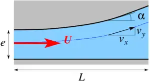 Considérons un liquide fortement confiné entre deux parois, comme représenté sur la figure ci-contre. Afin de simplifier cette étude, on se restreint à un écoulement à deux dimensions (le résultat reste valable pour un écoulement à trois dimensions). On peut projeter l'équation de Navier-Stokes sur les axes et :