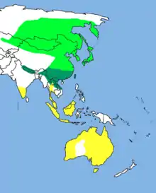 Son aire s'étend à travers la Sibérie, la Mongolie et l'Asie de l'Est ; il hiverne à travers l'écozone indomalaise et l'Australie.