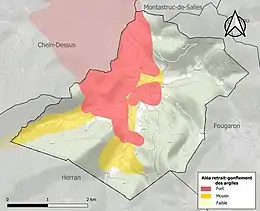 Le retrait-gonflement des sols argileux est susceptible d'engendrer des dommages importants aux bâtiments en cas d’alternance de périodes de sécheresse et de pluie. 36,9 % de la superficie communale est en aléa moyen ou fort (88,8 % au niveau départemental et 48,5 % au niveau national). Sur les 229 bâtiments dénombrés sur la commune en 2019, 213 sont en aléa moyen ou fort, soit 93 %, à comparer aux 98 % au niveau départemental et 54 % au niveau national. Une cartographie de l'exposition du territoire national au retrait gonflement des sols argileux est disponible sur le site du BRGM[29],[Carte 3].