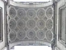 Le plafond des arcades, dont les arcs sont de plein cintre, est constitué de caissons de pierre ornés pour la moitié d'une couronne de laurier, et pour le reste du sigle signifiant « Le Roi, la Loi, la Liberté »[réf. souhaitée] .
