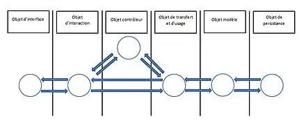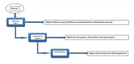 La mise en œuvre de l'architecture orientée objets se déroule principalement en trois phases[1] : l’analyse qui consiste à étudier les attentes des utilisateurs et les transformer en « objets métiers » et de « services » correspondant à des concepts réels de leur activité ; le design ou phase de conception qui décrit l'organisation des modules du logiciel : définition de l'interface utilisateur, mise en œuvre des règles de gestion et persistance des données ; l'implémentation, qui correspond à la phase de développement, qui affine les définitions de la phase de design en fabriquant les composants logiciels élémentaires nécessaires au logiciel.