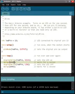 Le langage de programmation utilisé est le C++, compilé avec avr-g++[8], et lié à la bibliothèque de développement Arduino, permettant d'utiliser la carte et ses entrées/sorties. La mise en place de ce langage standard rend aisé le développement de programmes sur les plates-formes Arduino à toute personne maîtrisant le C ou le C++.