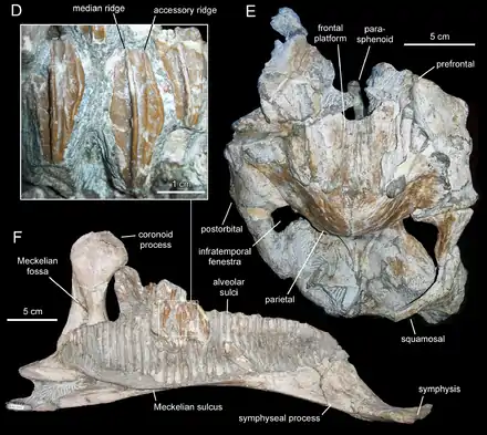 - une crête médiane du pariétal située au niveau de la barre postorbital-squamosal ;
