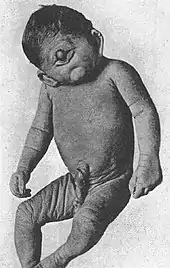 L'holoproencéphalie est une malformation congénitale du cerveau et de la face. Elle existe à des degrés divers et résulte en une séparation incomplète entre les deux hémisphères du cerveau et parfois entre les deux yeux. On parle alors de cyclopie ou cyclocéphalie. Il est aisé d'imaginer que la naissance d'un bébé présentant de telles malformations ait pu être la source de légendes terrifiantes. L'otocéphalie, elle, est une pathologie congénitale rare mais témoignant de l'existence de la cyclopie dans certains cas chez l'être humain.