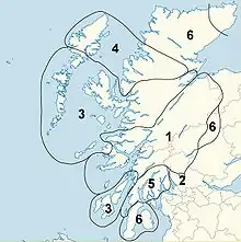 La tradition selon laquelle l'ouest de l'Écosse aurait été colonisée par des Gaëls, peuple celte d'Irlande, reste sujette à débat[C 4]. Nombre des personnages décrits dans cette période doivent ainsi être considérés en gardant à l'esprit qu'ils relèvent de traditions historiques médiévales. D'après le Lebor Gabála Érenn, le récit irlandais contenant les mythes fondateurs, vivait au Ier siècle un haut roi d'Irlande connu sous le nom de Conaire Mór. Ses descendants sont les Síl Conairi, signifiant la « graine de Conaire ». Parmi ceux-ci, son fils Cairbre Riada se rend dans le nord de l'Irlande, y étant amené par la famine, et conquiert le comté d'Antrim, faisant partie de l'Ulster[10]. D'après Bède le Vénérable, son territoire se serait appelé le Dalriada, signifiant « la partie de Riada »[D 1]. Selon les versions, il aurait navigué et atteint l'ouest de l'Écosse au IIIe siècle, étendant ainsi le royaume de Dalriada[D 1], ou ses descendants auraient fait le voyage[10]. Pendant deux cents ans, l'histoire de ce royaume demeure dans l'ombre, jusqu'au voyage vers l'an 500 d'un chef Gaël nommé Fergus Mòr. Fergus est un descendant de Riada, et il se trouve à la tête d'une vague de migration, déplaçant sa capitale de Dunseverick dans l'Antrim à Dunadd en Écosse[11]. Lui et ses frères Loarn et Oengus se partagent les terres, et forment les trois principaux clans ou cenél. Le clan de Fergus est le Cenél nGabráin, et il occupe l'île de Jura, le Kintyre et les terres à l'est telles que les îles d'Arran et de Bute. Le clan de Loarn, le Cenél Loairn, occupe les terres au Nord, y compris les îles de Mull, Coll et Tiree. Enfin, le clan d'Oengus, le Cenél nÓenguso, prend possession d'Islay. Le Cenél Comgaill apparaît vers 700. Issu du Cenél nGabráin, il occupe la péninsule de Cowal[C 5].