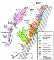 La majorité de la zone est formée de roches métamorphiques du Dalradien, avec trois groupes distincts. Le principal est fait de marbre, schistes et quartzites. Le second, s'étendant selon un axe sud-ouest nord-est le long du Loch Fyne, est fait de schiste vert et amphibolite. Le troisième, formé d'ardoise, s'étend selon le même axe en passant par Garelochhead. La zone d'ardoise est connue sous le nom d'Easdale, une des Îles Slate et autrefois le centre de l'industrie britannique de l'ardoise. Cette ardoise provient de profonds bassins générés par des failles[5],[6]. Parmi les autres types géologiques, l'île de Mull est essentiellement formée de roches volcaniques (basalte et andésite), l'ouest d'Islay ainsi que Tiree et Coll est fait de roches sédimentaires du groupe Torridonian et de roches métamorphiques telles que le gneiss Lewisien et le group de Moine[A 2]. Les roches d'Islay résultent de la présence de failles et d'une glaciation. Port Askaig, sur la côte est d'Islay, constitue un exemple avec des débris de roches entraînés par les glaciers, nommés tillite[5],[6]. Parmi les minerais disponibles dans la région se trouvent le plomb, la jaspe, et une catégorie de cristaux nommée spar[7].