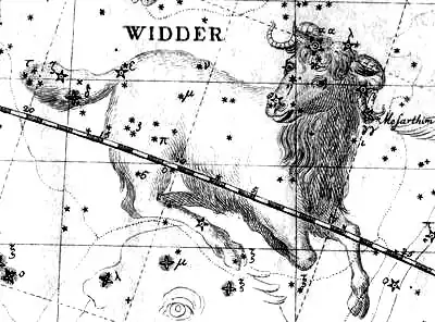 Avant même d’adopter le dessin grec de la sphère céleste, le monde Arabe voyait sur la bande de l’écliptique الحمل al-Ḥamal, « l’Agneau [mâle de moins d’un an] ». Venue de Babylone par le canal du zodiaque syriaque où nous avons Emməra [ḥasen], « l’Agneau (fort) », cette appellation est attesté dans l’horoscope de fondation de la ville de Baghdad en 762, ainsi que nous le rapporte l’érudit persan al-Bīrūnī[11]. Dans l'atlas céleste arabe des manāzil al-qamar ou « stations lunaires », l'agneau correspond à la figure du Superbélier. Ce dessin est plus vaste que la constellation grecque occidentale puisque Aliyat al-Ḥamal, « la Queue du Bélier », est dessinée dans le ciel par l'amas stellaire des Pléiades qui figure en occident dans le territoire astronomique du Taureau.
