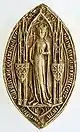 ![]() Marguerite de Provence (1221 † 1295), mariée en 1234 à Louis IX (1214 † 1270) Son sceau la représente couronnée avec le sceptre sous un dais et son contre-sceau montre une fleur de lys fleuronnée (identique à celui de son époux). Son père portait : d'or à quatre pals de gueules. Ses armes sont connues par d'anciennes clés de voûte, un sceau du Cartulaire des cordeliers de Pontoise, et plus récemment un petit objet d'argent, désigné sous le nom de palette[2]. | |