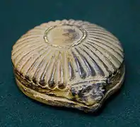 | Parure féminine en argent (pectoral) avec une représentation du dieu Haldi (sur le trône) et son épouse, la déesse urartienne Arubani. Le pectoral est conservé par un musée de Berlin. | Couvercle de chaudron en argent garni d'une figure représentant une grenade. Mentionné comme propriété du tsar Argishti Ier, Musée d'histoire de l'Arménie. |