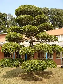 Étages superposés (plateaux de plan circulaire ou rectangulaire, boules, obélisques fractionnés) à l'origine d'ornements topiaires stylés dans les arts décoratifs.
