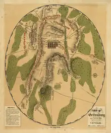 - près de "Big Round Top" : il s'agit de la charge de cavalerie nordiste ordonnée le soir du 3 juillet par Judson Kilpatrick contre l'aile droite des sudistes qu'il croyait complètement défaits. Les cavaliers bleus sont repoussés avec de très lourdes pertes