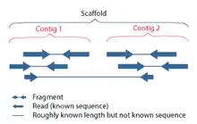 Lors de la création d'une ébauche de génome, les lectures (appelées ‘reads’) individuelles d'ADN sont ensuite assemblées en contigs. Un contig est une longueur contiguë de lectures (reads) dont l'ordre des bases est connu avec un niveau de confiance élevé. Les contigs par la nature de leur assemblage, présentent des lacunes entre eux. Les lacunes se produisent lorsque les lectures des deux extrémités séquencées d'au moins un fragment chevauchent d'autres lectures dans deux contigs différents. Puisque les longueurs des fragments sont approximativement connues, le nombre de bases entre les contigs peut être estimé. L'étape suivante consiste à combler les lacunes entre ces contigs pour créer un échafaudage, ce qui peut être fait en utilisant la cartographie optique ou le séquençage par paires de matrices