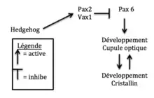 de la rétine et du cristallin comparé au témoin était observée. L’œil n’était tout de fois pas développé complètement comme les poissons de surface. Les gènes Hedgehog ne sont donc pas les seuls responsables pour la perte des yeux[31]. Ce qui se passe, c’est que les gènes Hedgehog produisent des protéines comme Pax2 et Vax1 qui inhibent l’expression de la protéine Pax6. Cette protéine est importante dans le développement des yeux et permet un développement normal. Quand Hedgehog est sur-exprimé dans l’embryon, Pax6 ne peut pas faire le développement normal de l’œil. C’est pour cette raison que la cupule optique perd sa partie ventrale et que d’autres parties de l’œil sont plus petites chez l’embryon du poisson des cavernes. De plus, les gènes Hedgehog ont aussi des effets sur le développement du cerveau. Des parties comme l’hypothalamus et le prosencéphale sont plus gros dans le poisson adapté aux cavernes. Ceci serait causé par une augmentation de la prolifération cellulaire. C’est l’augmentation de l’hypothalamus qui serait en cause pour l’augmentation des papilles gustatives[32].