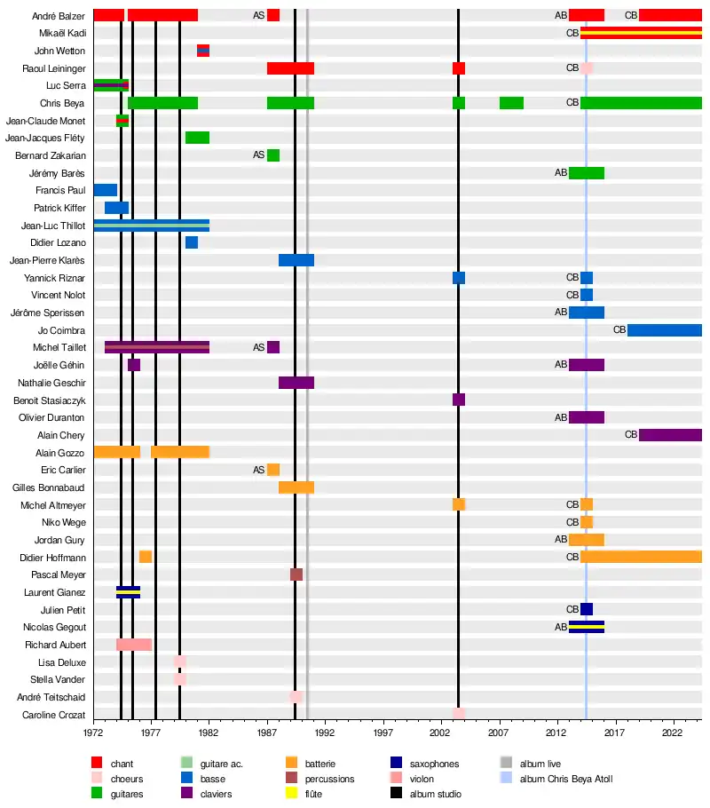 - Chris Beya - guitare, choeurs, claviers, basse (1975-1981, 1987-1990, 2003, 2007-2008, depuis 2014) (albums 2 à 8)