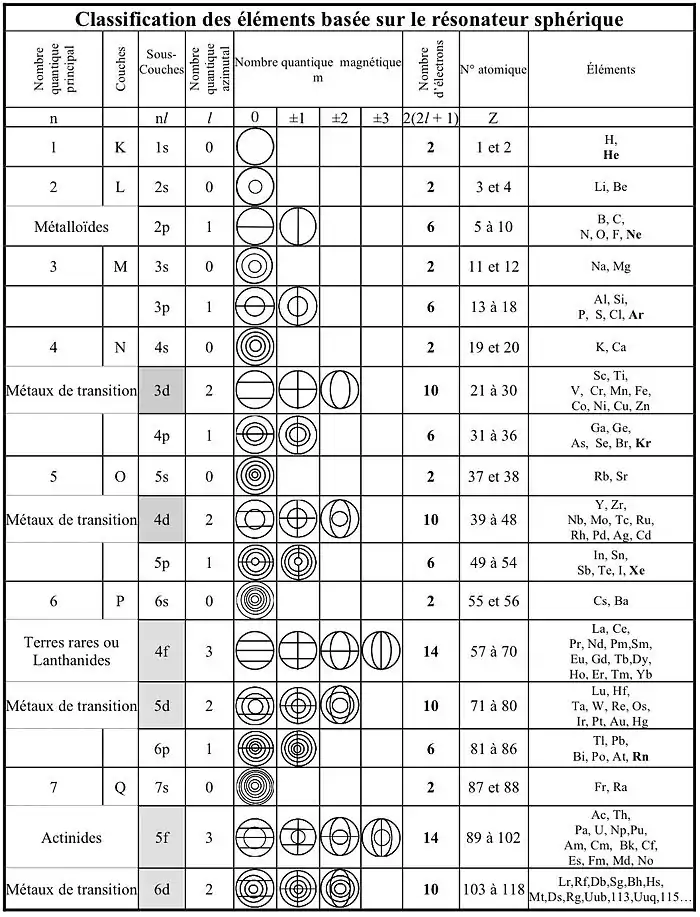 Le tableau ci-après[1] montre la structure vibratoire des éléments chimiques. Cette présentation est celle de Bohr, Sommerfeld, Pauli et d’autres moins connus, appelée classification rationnelle des éléments. Elle est basée sur la théorie de Schrödinger de l'atome d'hydrogène, en ne tenant compte que de façon limitée de la répulsion électrostatique des électrons responsables des permutations de sous-couches.