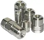 - Les buses bifluide[4] : le liquide est alimenté à une pression relativement basse. La dispersion en gouttelettes se fait par un jet d’air comprimé à haute vitesse.