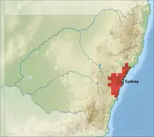 Cette espèce est endémique de Nouvelle-Galles du Sud en Australie. Elle se rencontre au Sud du fleuve Hunter, à l'Est des Montagnes Bleues et jusqu'à la région d'Illawarra au Sud. Elle est très présente dans la banlieue de Sydney[1].