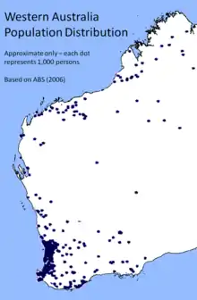 L'aire urbaine de Perth a une population estimée à près de 1,26 million en 2007 (75 % de l'État). Les autres centres de population majeurs sont Mandurah, Bunbury, Kalgoorlie, Albany, Geraldton, Port Hedland (11 557 personnes), et Broome (cf. Villes principales)[20].