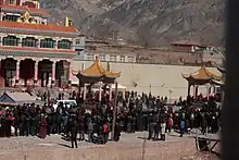 Selon le Centre tibétain pour les droits de l'homme et la démocratie, le 12 avril 2011, des Tibétains demeurant à Ngaba se rassemblèrent devant le monastère pour bloquer les forces de l'ordre après avoir entendu dire que certains moines allaient être arrêtés. La police aurait battu et blessé grièvement certains des manifestants. Cependant, le bureau d'information du parti communiste du comté de Ngaba dément les faits, déclarant qu'il n'y avait pas eu de heurts, que dans le cadre de ses patrouilles habituelles dans le comté la police passe devant le monastère. Il était faux de dire que des policiers stationnaient devant le monastère et que des gens avaient été battus[51].