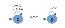 on dépile d'abord le symbole , puis on empile le mot , donc est remplacé par . Si le mot est vide, l'opération consiste donc simplement à dépiler ; si le mot commence par , donc si , l'opération revient à empiler, par-dessus , une autre mot . Un troisième avantage de cette notation compactée est que l'on peut tester quelle est la nature du symbole en haut de pile, simplement en le lisant et en le remettant.