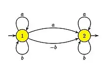 L'automate ci-contre[2] a deux états. C'est un automate sur l'anneau des entiers . La représentation graphique indique que le vecteur d'entrée est , le vecteur de sortie transposé est , et les deux matrices de transition sont :