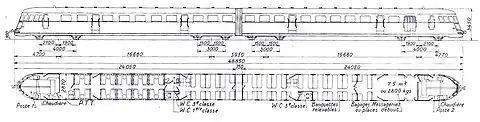 Pour les trois exemplaires d'origine, l'une des caisses comporte une cabine de conduite, un compartiment fourgon de 2 t, une salle deux compartiments de 1re/2e classe de six places chacun, une salle de 1re/2e avec 18 places en 2 + 1, une plate-forme d'accès et le WC, un bar-buffet et 12 places de 3e classe sur des banquettes. Au delà de l'intercirculation, l'autre caisse est aménagée en 3e classe en configuration 3 + 2 répartie en 3 salles, respectivement de 21, de 50 et de 19 places séparées par une deuxième plateforme d'accès où se trouvent également des toilettes puis une troisième plateforme d'accès qui comporte trois strapontins ; la caisse se termine par une cabine de conduite[6]. Dans chaque caisse, une chaudière au coke[N 1] assure, par l'intermédiaire de radiateurs à eau, le chauffage des salles voyageurs[8] ; elle prend place dans la cabine de conduite, agrandie pour la circonstance[5].