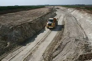 Pour améliorer la portance des sols, un traitement aux liants hydrauliques a été réalisé. On a pu voir ainsi jusqu’à huit ateliers complets de traitement de sol (épandeuse Panien – stabilisatrice de sol Wirtgen 2500). Le dosage en matériaux hydrauliques est de 5 % pour les couches de forme et de 2,5 % pour l’arase avec des ajouts d’eau qui peuvent aller jusqu’à 60 l/m³. Au total ce sont plus de 3 000 000 m3 de matériaux qui ont été valorisés[36].