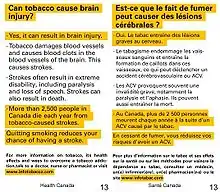 Le Canada innove encore en ajoutant un dépliant informatif à l'intérieur du paquet, et en rendant obligatoire la mention non seulement du taux minimum de substances inhalées, mais aussi les valeurs maximales (pour prendre en compte les différentes façon d'inhaler la fumée chez les fumeurs) sous forme d’une fourchette plus réaliste, et en ajoutant (aux classiques taux de goudrons et nicotine) le monoxyde de carbone, et trois autres substances très toxiques : le méthanal, le benzène, et l’acide cyanhydrique (ou cyanure d'hydrogène)[3].