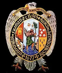 Les armoiries de Huamanga ont été accordées par Philippe II en 1564 à la demande de Don Juan Pantiel de Salinas, corrégidor de la municipalité[9]. Le château d'or (jaune) sur champ d'azur (bleu) de l'écu de forme « française moderne », fait allusion à une forteresse (pukaray) qui se trouvait près de la ville et au fait qu'elle défendait la frontière avec le territoire indien.