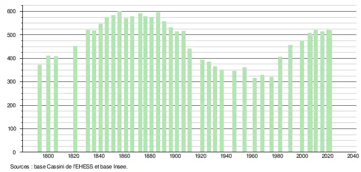 L'évolution du nombre d'habitants est connue à travers les recensements de la population effectués dans la commune depuis 1793. Pour les communes de moins de 10 000 habitants, une enquête de recensement portant sur toute la population est réalisée tous les cinq ans, les populations légales des années intermédiaires étant quant à elles estimées par interpolation ou extrapolation[16]. Pour la commune, le premier recensement exhaustif entrant dans le cadre du nouveau dispositif a été réalisé en 2005[17].