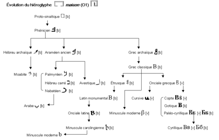La lettre B tire probablement son origine de l'alphabet proto-sinaïtique, un alphabet utilisé dans le Sinaï il y a plus de 3 500 ans, lui-même dérivé des hiéroglyphes égyptiens ; le son, /b/, était alors représenté par une maison.
