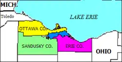 La baie de Sandusky est bordée par trois comtés des États-Unis, le comté d'Erie, le comté d'Ottawa et le Comté de Sandusky. On y trouve plusieurs petites îles, dont l'île Johnson.