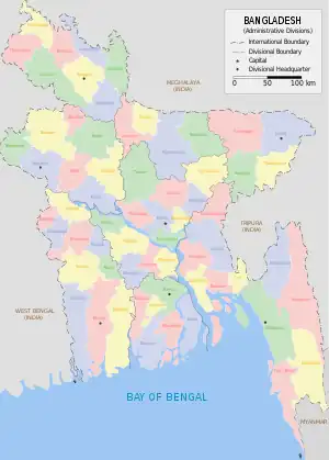 Les huit divisions sont, du nord au sud, Rangpur, Mymensingh, Rajshahi, Sylhet, Dhaka, Khulna, Barisal et Chittagong, chacune nommée d'après leur capitale[63]. Il existe 64 districts et 482 upazilas.