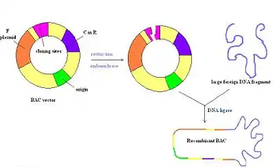 Les chromosomes artificiels bactériens (BAC) sont des molécules d'ADN circulaires, généralement d'environ 7 kb de longueur, qui sont capables de contenir des inserts jusqu'à 300 kb. Les vecteurs BAC contiennent un réplicon dérivé du facteur F dE. coli, ce qui garantit qu'ils sont maintenus à une copie par cellule[4]. Une fois qu'un insert est ligaturé dans un BAC, celui-ci est introduit dans des souches déficientes en recombinaison dE. coli par électroporation. La plupart des vecteurs BAC contiennent un gène de résistance aux antibiotiques et également un marqueur de sélection positive[2]. La figure de droite représente un vecteur BAC coupé avec une enzyme de restriction, suivi de l'insertion d'un ADN étranger qui est réannexé par une ligase. Dans l'ensemble, il s'agit d'un vecteur très stable, mais certains peuvent être difficiles à préparer en raison de la présence d'une seule origine de réplication, tout comme les PAC[15].