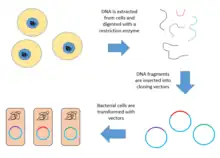 La construction d'une banque génomique implique la création de nombreuses molécules d'ADN recombinant. L'ADN génomique d'un organisme est extrait puis digéré par une enzyme de restriction. Pour les organismes à très petits génomes (environ 10 kb), les fragments digérés peuvent être séparés par électrophorèse sur gel. Les fragments séparés peuvent ensuite être excisés et clonés séparément dans le vecteur. Cependant, lorsqu'un génome de grande taille est digéré par une enzyme de restriction, il y a beaucoup trop de fragments pour les exciser individuellement. L'ensemble complet des fragments doit alors être cloné avec le vecteur, et à ce moment-là on peut séparer les clones. Dans les deux cas, les fragments sont ligaturés dans un vecteur qui a été digéré avec la même enzyme de restriction. Le vecteur contenant les fragments d'ADN génomique insérés peut ensuite être introduit dans un organisme hôte[1]. Voici les étapes de création d'une banque génomique à partir d'un grand génome :