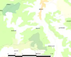 Les communes les plus proches[Note 1] sont[3] : Bénac (0,9 km), Layrisse (1,5 km), Averan (1,7 km), Lanne (2,2 km), Hibarette (2,3 km), Orincles (2,4 km), Julos (3,0 km), Louey (3,3 km).