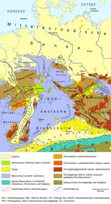 La croûte terrestre à l'ouest et au sud du Craton d'Europe de l'Est (Baltica) fait partie d'un système de rifts cénozoïques de préférence orientées nord-sud, qui s'étend de la mer du Nord à travers l'ouest de l'Allemagne et l'est de la France vers le sud jusqu'à l'estuaire du Rhône plus à l'ouest vers l'est de la méditerranée [1],[2]. Dans sa section sud-ouest de l'Allemagne (entre Mayence et Bâle), il trouve son expression dans le fossé rhénan, dont l'effondrement a commencé au début du tertiaire, il y a environ 50 MA (Éocène).