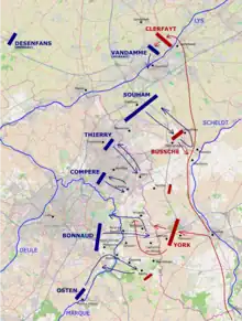Les Français répondent aux avancées d'York et de Clerfayt en lançant une attaque contre les forces d'York avec les divisions Souham et Bonnaud, et les brigades Compère et Thierry, soit toutes les forces disponibles dans la région entre l'Escaut et la Lys. Cependant, Bonnaud est repoussé à la bataille de Willems (en) grâce à l'utilisation habile de la cavalerie par York, ce qui a conduit au retrait des autres unités impliquées dans l'offensive, car la doctrine militaire alors en vigueur dicte que les unités d'une armée doivent avancer et reculer étalés, mais alignés les uns sur les autres, pour exercer une pression égale en tous points sur l'armée ennemie. Bien que victorieux à Willems, York se rend compte qu'il est largement en infériorité numérique, et se retire à Tournai pour appeler des renforts. Le retrait d'York permet aux Français de consacrer désormais toute leur attention à Clerfayt.