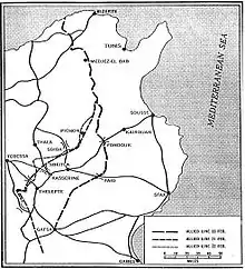 Le , la 1re armée britannique entre en Tunisie[B 1]. Le , son aile gauche approche de Mateur, sur la route de Bizerte, et son aile droite atteint Djedeida dans la vallée de la Medjerda (25 kilomètres de Tunis). La Tunisie centrale est envahie[B 2]. Le , les parachutistes britanniques du colonel Edson Duncan Raff, venant de Tébessa, s'emparent de Kasserine et de Gafsa. Mais malgré plusieurs tentatives pour prendre Tunis avant l'arrivée importante de troupes italo-allemandes, l'avantage défensif que procure le terrain et la mauvaise coordination alliée permettent aux faibles troupes allemandes et italiennes débarquées de résister devant l'avance alliée[B 1].