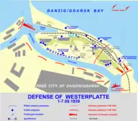 La bataille de Westerplatte est un affrontement entre les troupes allemandes et la garnison polonaise stationnée à Dantzig entre le 1er et le 7 septembre 1939[1]. Cette bataille est la première de la campagne de Pologne. C'est sur la péninsule de Westerplatte, à côté de Dantzig (ou Gdansk) en Pologne, qu'eut lieu le premier affrontement de la Seconde Guerre mondiale[1]. Petite île boisée séparée de Dantzig par le chenal menant au port, Westerplatte était, durant l'entre-deux-guerres, un avant-poste militaire.