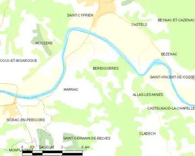 Dans le quart sud-est du département de la Dordogne et bordée par la Dordogne, la commune de Berbiguières est située en Périgord noir.
