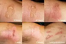 La Berce du Caucase produit des furocoumarines (psoralène et ses dérivés bergaptène et xanthotoxine)[12], présentes dans la sève. La sève est incolore avec une odeur agréable assez caractéristique due aux furocoumarines (voir aussi coumarine)[13]. Ces substances sont photosensibilisantes : la réaction se déclenche seulement lorsque la peau imprégnée est exposée à la lumière, notamment aux rayonnements solaires. Si l'on n'expose pas à la lumière la zone touchée pendant plusieurs jours, la réaction ne se déclenche pas[4]. Elle provoque des inflammations et des brûlures de la peau. Les cloques provoquées peuvent atteindre la taille d'une pomme de terre. Les séquelles n'apparaissent qu'après plusieurs heures et peuvent dans certains cas laisser des traces qui persistent des années[14].
