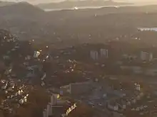 Bergensdalen au premier plan, Løvstakken au centre, Store Lungegardsvannet, Bergenhus et Fløyen à droite.
