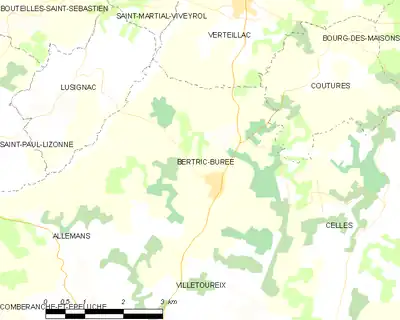 Bertric-Burée est limitrophe de sept autres communes, dont Saint-Martial-Viveyrol au nord-ouest, par un simple quadripoint.