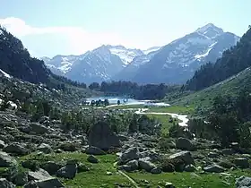 Paysage du Besiberri : vallée suspendue de l'Estanyet de Besiberri à 2 000 mètres d'altitude et sommets de l'Alta Ribagorça en fond.
